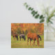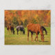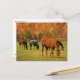 This postcard features fine art photography of a lovely rural autumn landscape with horses grazing the green grass. A hill looms behind them in glorious fall foliage colours of red, orange, gold, yellow, brown and green.