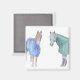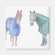 Colour pencil illustration of a chestnut pony and a grey horse wearing their New Zealand turnout rugs.