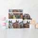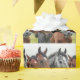 Three beautiful horses standing in a pasture make up this lovely photograph design. On each end a brown horse with white markings and in the centre a grey horse with white markings. This stunning animal photo makes the perfect design for animal and horse lovers.