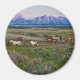 This photo features a herd of horses runs in front of the Grand Teton mountain range in rural Wyoming during the early morning light.