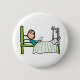Hospital Bed design shows stickman reading a card while lying in bed. Has a broken leg in a signed cast raised by special equipment. Patient has comfy pillows and a relaxed resigned attitude to a hospital stay. Get well soon!