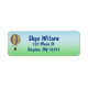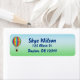 A hot air balloon sails through the sky next to your name and address in dark blue.