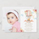 Whimsical Jungle Animals Hot Air Balloon Birthday Invitation, featuring cute watercolor baby animals in a pretty blush and pink floral hot air balloon, Personalise it with your party details easily and quickly, simply press the customise it button to further re-arrange and format the style and placement of the text. Matching items available in store! (c) THE HAPPY CAT STUDIO