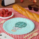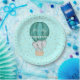 These adorable party plates feature a whimsical baby elephant flying in a hot air balloon. The background is a light teal blue with gold foil glitter falling down from the sky. Invitations and other coordinating items are in my shop.