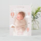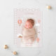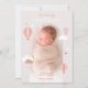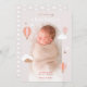 A newborn Baby Girl Birth Announcement with whimsical Hot Air Balloons, Clouds and Stars with fake foil accents creating an arch over the baby photo. Colours are shades of pink.