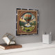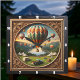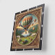 This appealing square wall clock features a colorful illustration of a large hot air balloon festival. The central scene, contained within a decorative inner circle, shows numerous brightly patterned balloons soaring above a river valley. The foreground depicts a festival area with white tents, spectators, and vintage vehicles, including a pickup truck and a trailer. The circular scene is surrounded by an elaborate wood-look carved border with gold accents and foliage motifs. The entire illustration is set within a wide, dark outer wood-look frame, which is simulated using high-detail artwork and is not real wood.