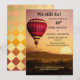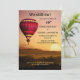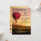 A romantic wedding anniversary invitation featuring a painting of a hot air balloon over a dreamy landscape at sunset. The back shows a gold printed chequered design.