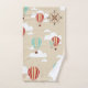 Adorable hot air balloon traveller themed bath towels. They feature red and blue hot air balloons, cute dotted line white fluffy clouds, beige background, and accenting compass rose on the bath towel.