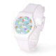 Multi-coloured hot air balloons in cloudy dotty blue sky on watch.