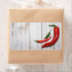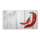 Corner border of red and green hot chilli peppers organically grown on a white washed wooden background