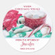 Festive baking kitchen sticker personalised with your name. A warm comforting Christmas photo. A hot cup of cocoa with marshmallows in a cute red and white polka dot mug. A striped candy cane resting on a green and white striped scarf covered in snow. Ahhh, a warm drink after coming in from the cold really hits the spot. A festive holiday photo. Warm Christmas Wishes written in a simple yet classic modern font.