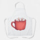 A person wearing a white apron featuring a graphic print of a large red mug filled with hot cocoa and marshmallows. This item is designed for use in a kitchen or as a festive gift, often associated with the holiday season.