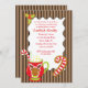 Cookies anyone? Nothing says the holidays more than a good old fashioned cookie exchange! Invite your family and friends over for some baked goods with this adorable cookie swap invitation. It's set on a dark and light brown striped background. There's a white curvy tag in the centre. On the bottom left corner there's a red with green mug of hot chocolate with a reindeer on the front. There's marshmallows and a striped straw coming out of it. There's a candy cane shaped cookie next to it. Use the back of this cute invitation to explain how a cookie swap works. Check out the many other designs we have.
