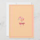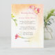 Watercolor pink and orange flowers with delicate foliage decorate a subtle wash of tropical colour. A romantic wedding design with perfect elements of flower stems, cloud like white overlay, and classy serif typography. Accented with calligraphy script, and a stem tied with a pink bow on the reverse.