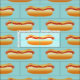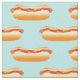 This fabric features a pattern of a delicious cartoon hot dog illustration. The hot dog has a tasty looking bun and there are both ketchup and mustard on top of the sausage.