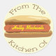 A sticker featuring an illustration of a hotdog in a bun. Personalise with your name in yellow as the mustard. Text around sticker reads "From The Kitchen Of."
