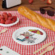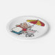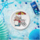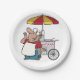 A hot dog vendor with his hot dog cart. This design looks really effective on these Paper Plates