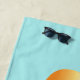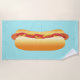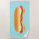 This beach towel features Destei's illustration of a tasty looking hot dog that has ketchup and mustard on it. The background colour is light blue.