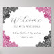 Elegant hot pink and black wedding welcome sign featuring delicate floral lace.