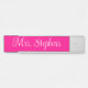 A simple modern minimalist curly calligraphy name design with a girly hot pink background on a door sign name plate.