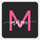 Hot Pink Black Modern Script Girly Monogram Name Square Sticker