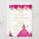 This elegant and glamorous birthday party invitation features a beautiful princess with blonde hair and fair skin in a hot pink ball gown. The text combines handwritten script and modern sans serif fonts for a classy and sophisticated look. The floral arrangements, butterflies and gold confetti create the perfect blend of rustic and chic.