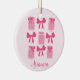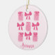 Hot Girls Love Pickles! This ornament features a playful, hot pink pickle jar and bow grid graphic on a soft pink background. Within each square of the grid, alternating graphics of adorable pickle jars and bows add a touch of whimsy and fun. A perfect blend of the coquette bow and pickle trends! Personalisation is featured in a sweet hot pink script font across the bottom of the graphic. Makes a truly unique and delightful gift for yourself or any pickle loving girl or woman in your life.