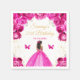 This elegant and glamourous birthday party napkin features a beautiful princess with dark skin in a hot pink ball gown. The text combines handwritten script and modern sans serif fonts for a classy and sophisticated look. The floral arrangements, butterfly and gold confetti create the perfect blend of rustic and chic.
