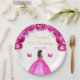 This elegant and glamourous birthday party plate features a beautiful princess with dark skin in a hot pink ball gown. The text combines handwritten script and modern sans serif fonts for a classy and sophisticated look. The floral arrangements, butterfly and gold confetti create the perfect blend of rustic and chic.
