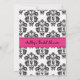 Girly and sophisticated Parisian style french themed bridal shower invitations with a vintage antique black and white damask floral border, hot pink fuchsia hue printed ribbon look design and the Eiffel Tower on it. Designed by Chrissy H. Studios, LLC. All Rights Reserved.
