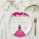This elegant and glamourous birthday party plate features a beautiful princess with dark hair and dark skin in a hot pink ball gown. The text combines handwritten script and modern sans serif fonts for a classy and sophisticated look. The floral arrangements, butterflies and gold confetti create the perfect blend of rustic and chic.