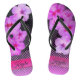 Bright hot pink shades of hibiscus flowers on a pink and black half tone gradient pattern for contrast also adding the black straps really make it pop. Girly stylish charm. Can be personalised below on a hot pink ribbon.