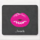 A mouse pad with an illustration featuring hot pink lips. Bold and vibrant image. Set on a black mottled background.