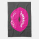 A kitchen towel with an illustration featuring hot pink lips. Bold and vibrant image. Set on a black mottled background.