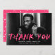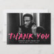 Stylish, modern graduation thank you card featuring the graduate's horizontal photo with "Thank You" in hot pink lettering with white paint splatters. Personalise the front of the creative thank you card by adding the graduate's name, school name, and graduation year. The back of the graduation photo thank you card features space for a typed or handwritten thank you message and a hot pink and white paint splatter background.