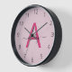A striking blend of style and functionality, this personalised clock features a bold, hot pink monogram set against a soft pink background, showcasing an elegant, handwritten script for the name. The minimalist design balances vibrant modernity with a touch of femininity, making it a standout piece for any room that calls for sophistication. Its sleek black frame and precise numbering create a perfect harmony between timeless design and everyday practicality.