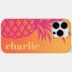 Phone case featuring a hot pink pineapple and your custom name or text aligned vertically to the right on a yellow to orange gradient background.