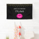 A birthday banner with a drawing of a pair of shiny pink feminine lips on a black background. Faux gold foil confetti along the top.