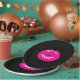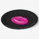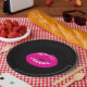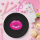 Paper plates with a drawing of a pair of shiny pink feminine lips on a black background.