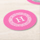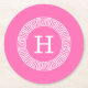 Hot Pink Wht Greek Key Rnd Frame Initial Monogram Round Paper Coaster