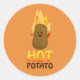 Funny brown potato with a happy face and flames coming out of his top half. Below are the word Hot Potato.