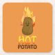 Fun cartoon brown potato with a big happy smile, dots for eyes and sticks for arms. He is surrounded by yellow and orange hot burning flames. Below him in orange and yellow text is the word HOT and below that in brown text is the word POTATO. Fun quirky design for a laugh.
