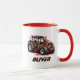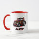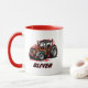 This high-octane personalized Racing Tractor mug features a heavy-duty tractor decked out in classic hot rod flames and aggressive red accents.