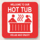 This stylish red and white Hot Tub sign drinks coaster is great fun for entertaining your friends and relatives. Available on other products this Hot Tub sign drinks coaster is designed as a red and white welcome sign complete with hot tub symbol and a welcome slogan that reads: WELCOME TO OUR HOT TUB RELAX AND ENJOY. This Hot Tub coaster will be a great addition to your Hot Tub party. There are loads more fun Hot Tub party ideas and Hot Tub accessories available in the Sand Dunes store. Take a look today!