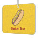 Cartoon illustration of hotdog. Junk food outline icons yellow pattern background. Custom text on both sides.