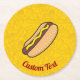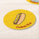 Cartoon illustration of hotdog. Junk food outline icons yellow pattern background. Custom text.