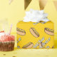 Cartoon illustration of hotdog. Seamless pattern. Custom background colour. Custom text.