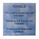 Towel conservation sign for a hotel. Please hang towels you will use again. Towels on the floor will be replaced. Thank you for helping us conserve.