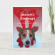 Hound dog sitting in the snow wearing reindeer holiday card