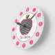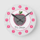 A clock for teachers featuring an illustration of a houndstooth apple Personalise with your name under apple. Clock features white numbers on pink dots.